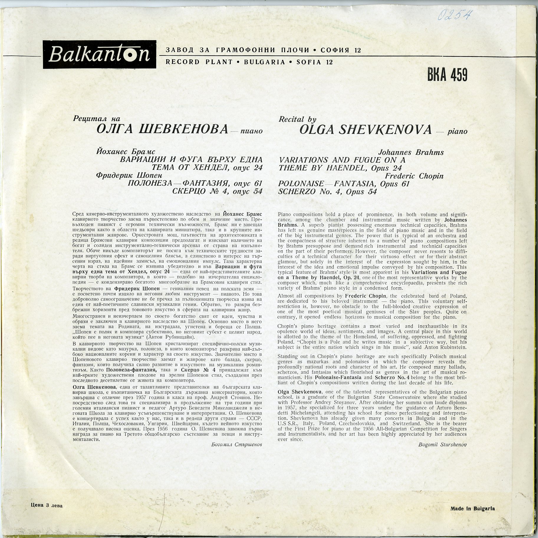 勃 BALKANTON BKA 459 勃 BALKANTON BKA 459 (BKA459) オルガ・シェフケノヴァ ショパン:幻想ポロネーズ,スケルツォ No.4,ブラームス:ヘンデルの主題のよる変奏曲とフーガ 在庫状態 : 在庫有り ¥11,000(税込) 数量