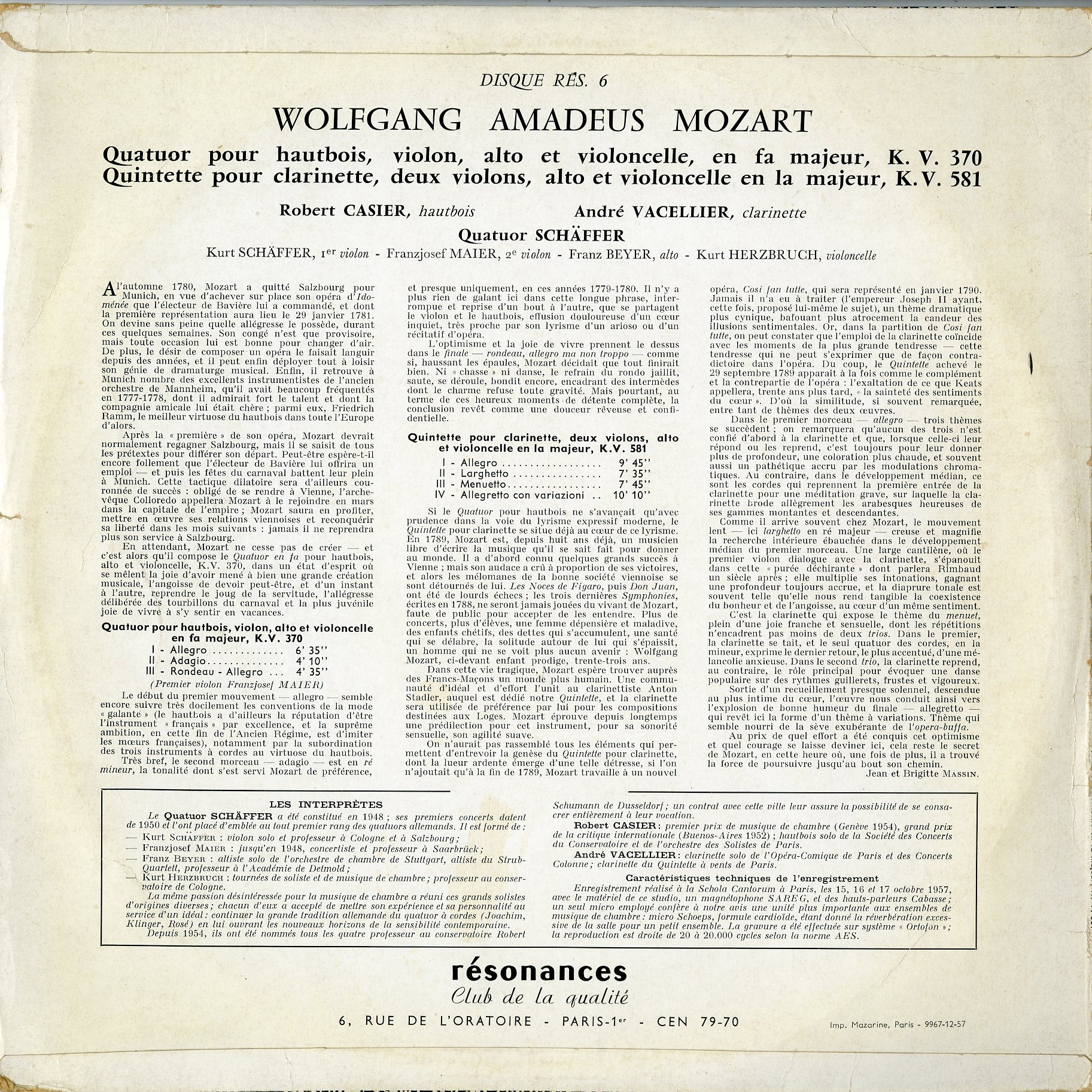 モーツァルト:クラリネット五重奏曲 A.ヴァセリエ(Cl),オーボエ四重奏曲 R.カシェ(Ob) シェーファーSQ