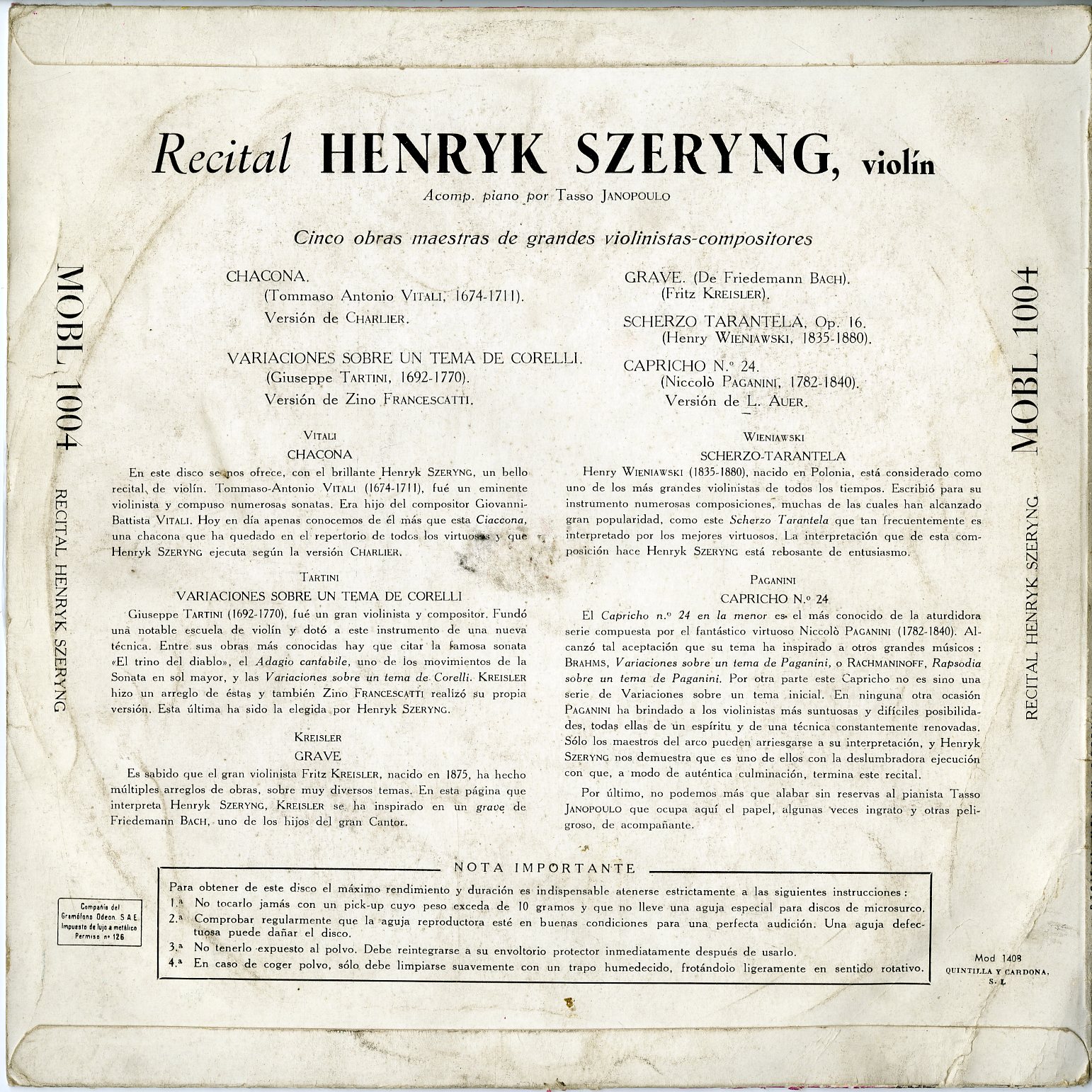 西 ODEON MOBL 1004 西 ODEON MOBL 1004 (MOBL1004) シェリング ヴィターリ:シャコンヌ,タルティーニ:コレルリの主題による変奏曲,クライスラー:グラーヴェ,ヴィニャフスキー:スケルツォ・タランテラ,パガニーニ/イザイ:カプリース No.24 タッソ・ヤノポウロ(Pf) <10inch> 在庫状態 : 在庫有り ¥77,000(税込) 数量