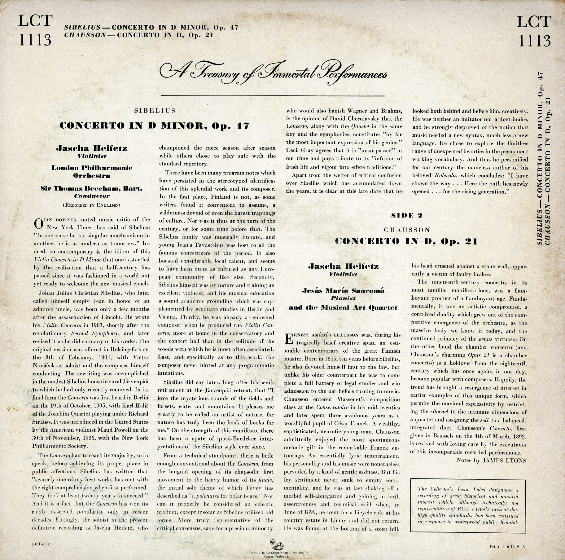 ハイフェッツ シベリウス:Vn Con ビーチャム/LPO,ショーソン:コンセール サンロマ(Pf),ミュージカル・アート四重奏団
