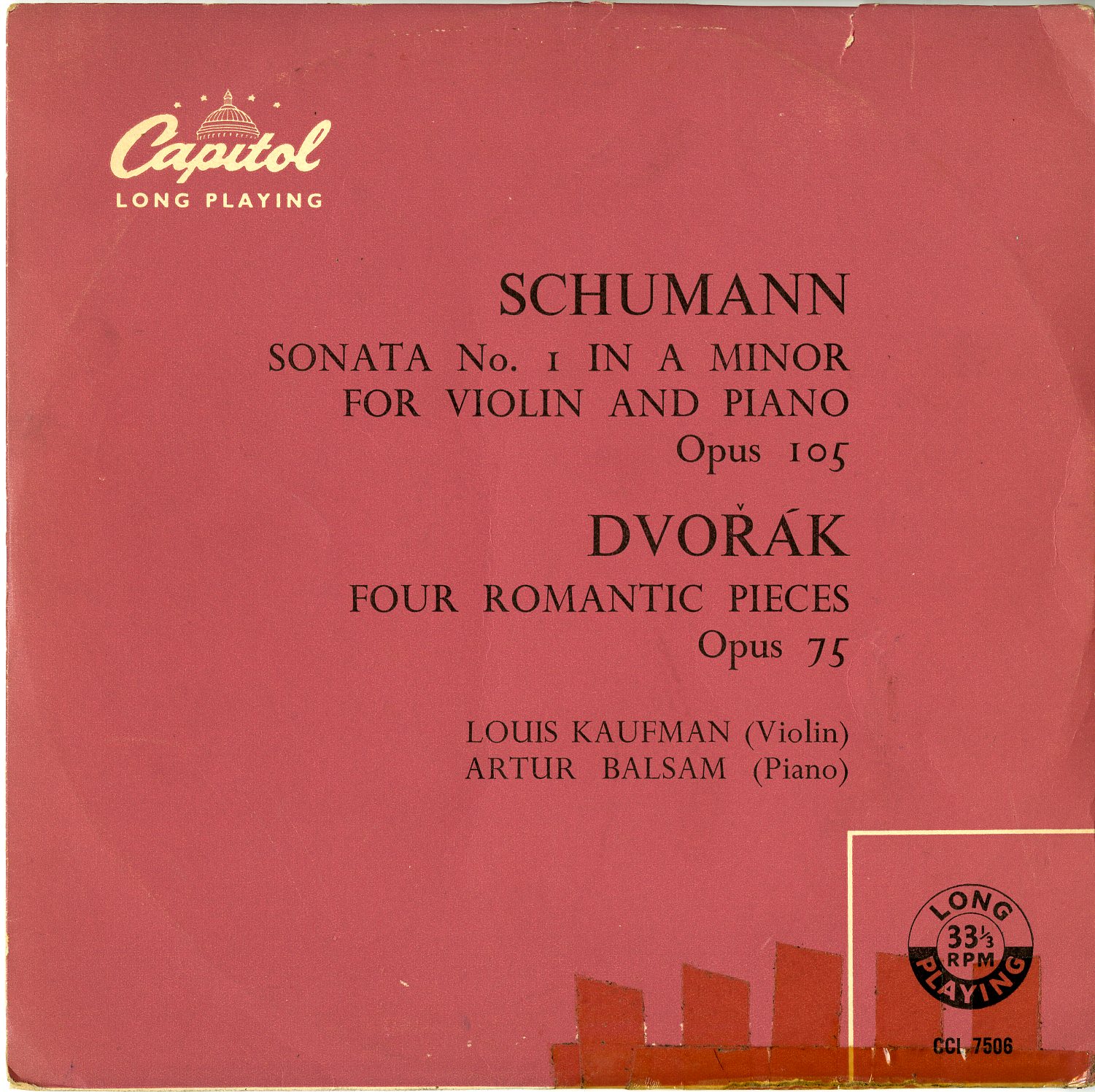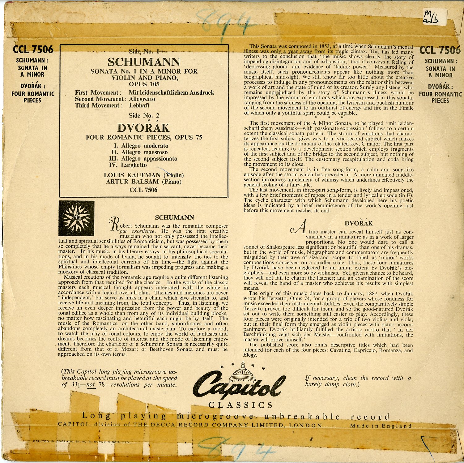 ルイス・カウフマン シューマン:Vn ソナタ No.1,ドヴォルザーク:4つのロマンティックな小品 バルサム(Pf) <10inch>