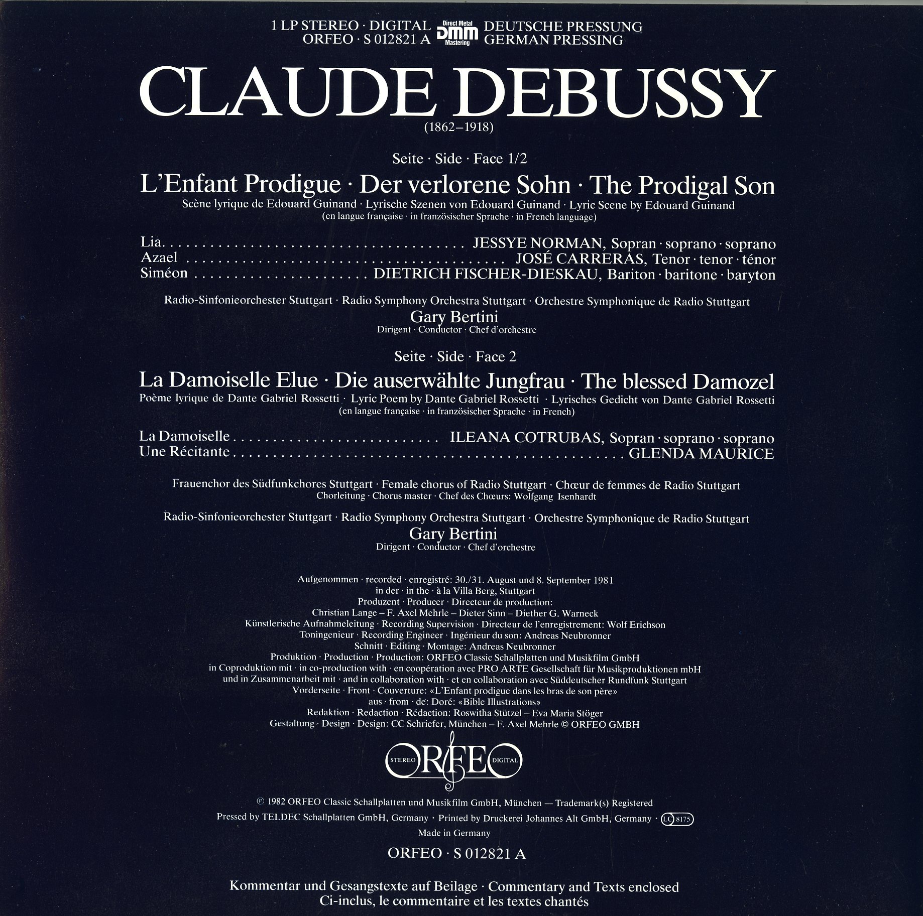 ドビュッシー:放蕩息子 J.ノーマン(S),カレラス(T),F-ディースカウ(Br),選ばれた乙女 I.コトルバシュ(S) ベルティーニ/シュトゥットガルトRSO ★